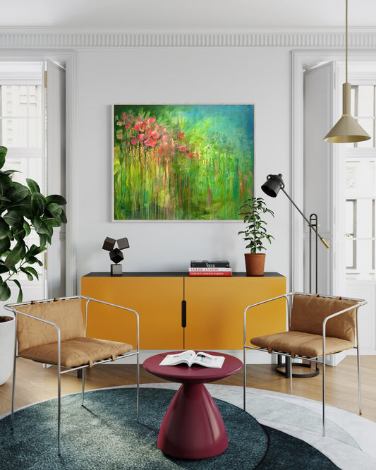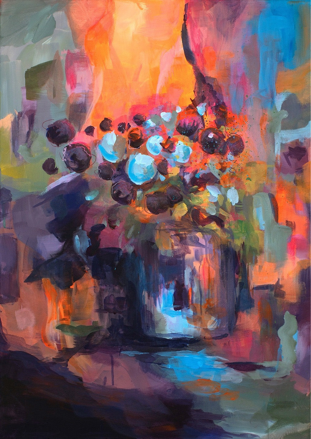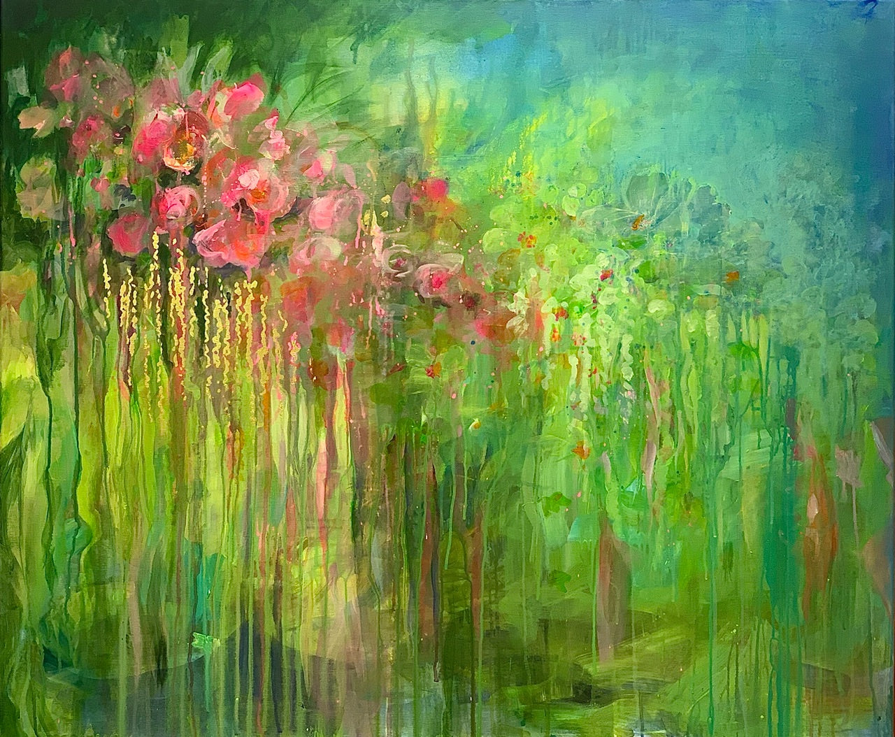 There is a lot going on in my head, many parallel tracks, many ideas, color and form. It comes out in different expressions and my process is that I have many paintings going at the same time, the desire is allowed to rule and then they will be ready as time goes on. Here you can see a part of it, section of an inner garden you could say.