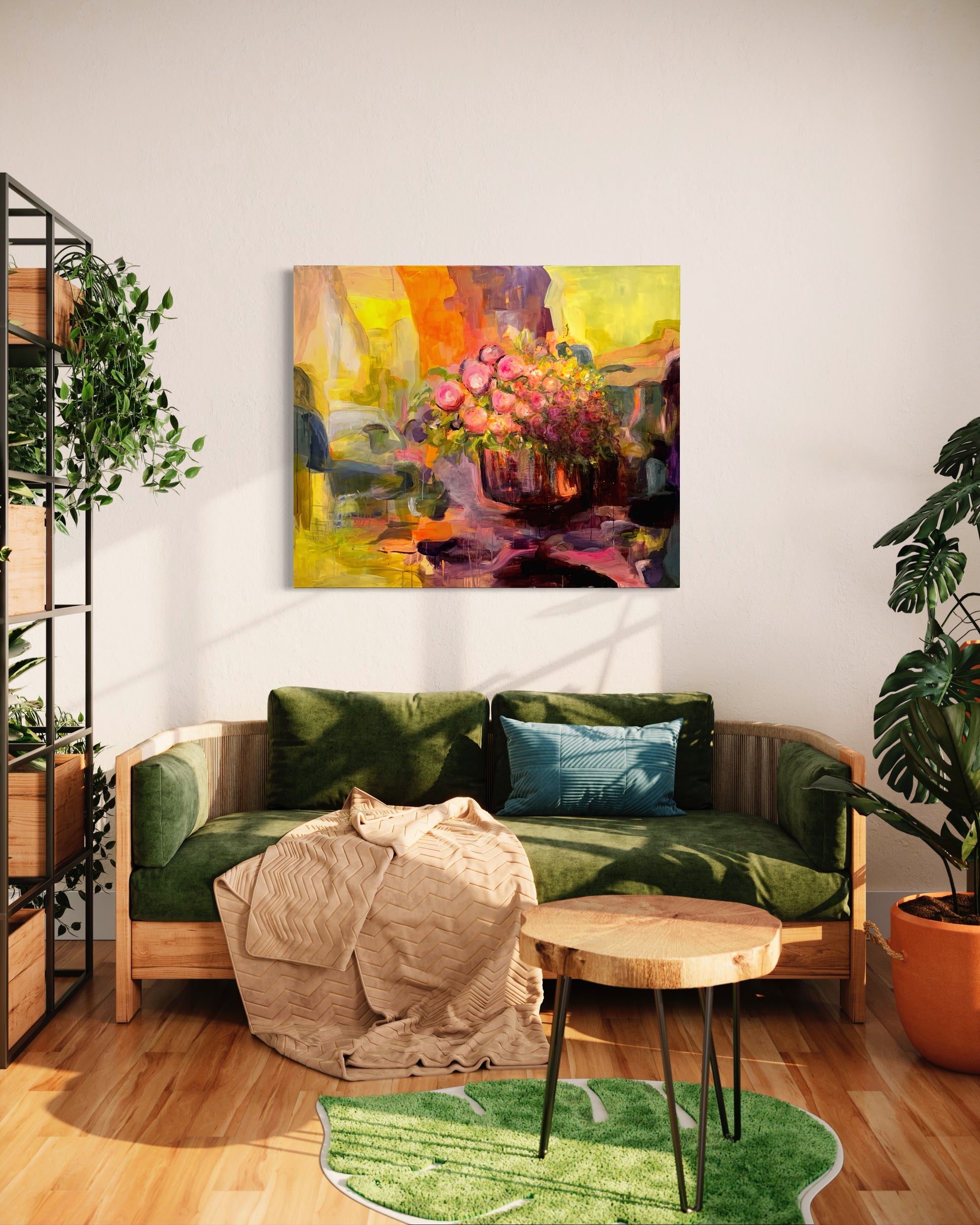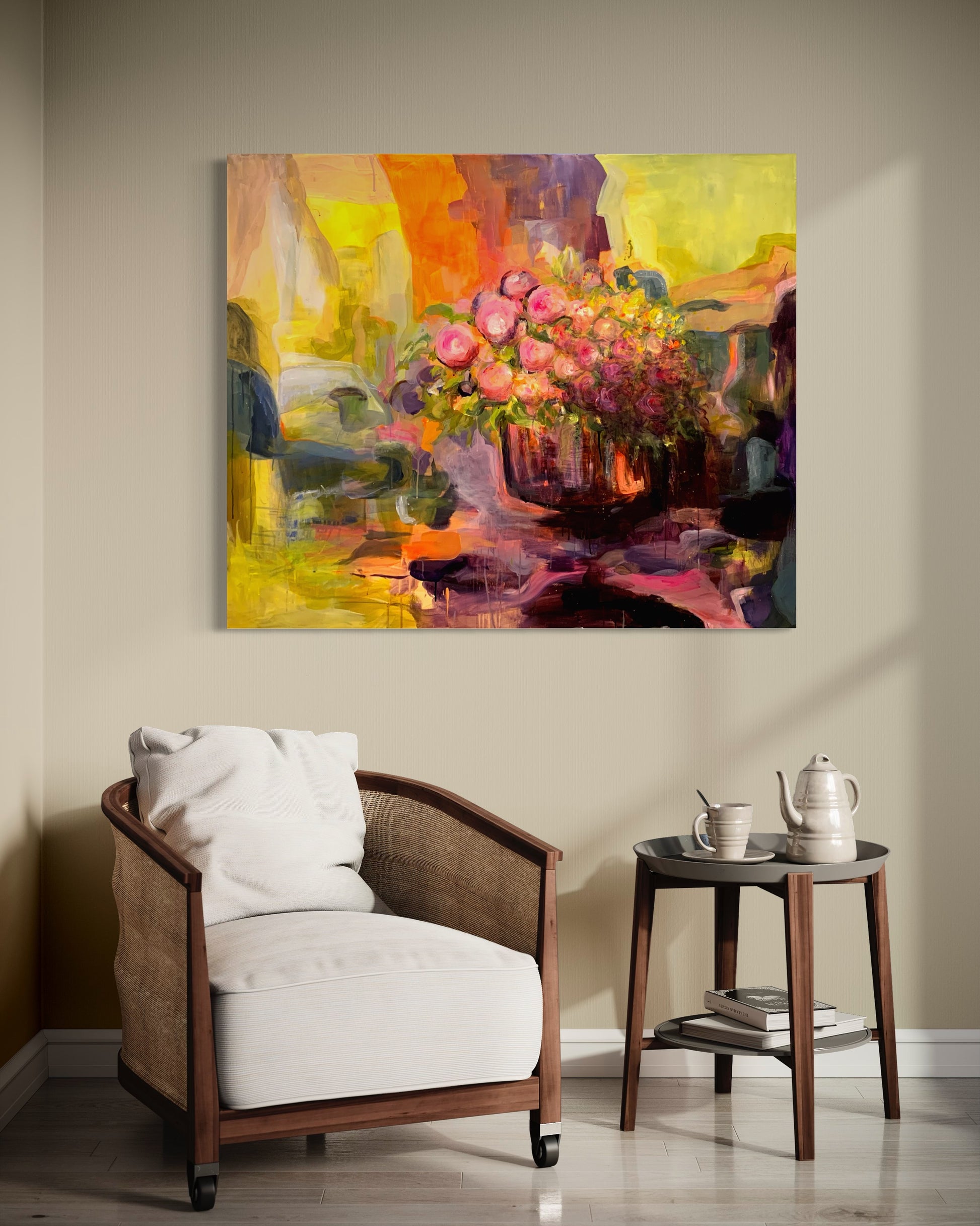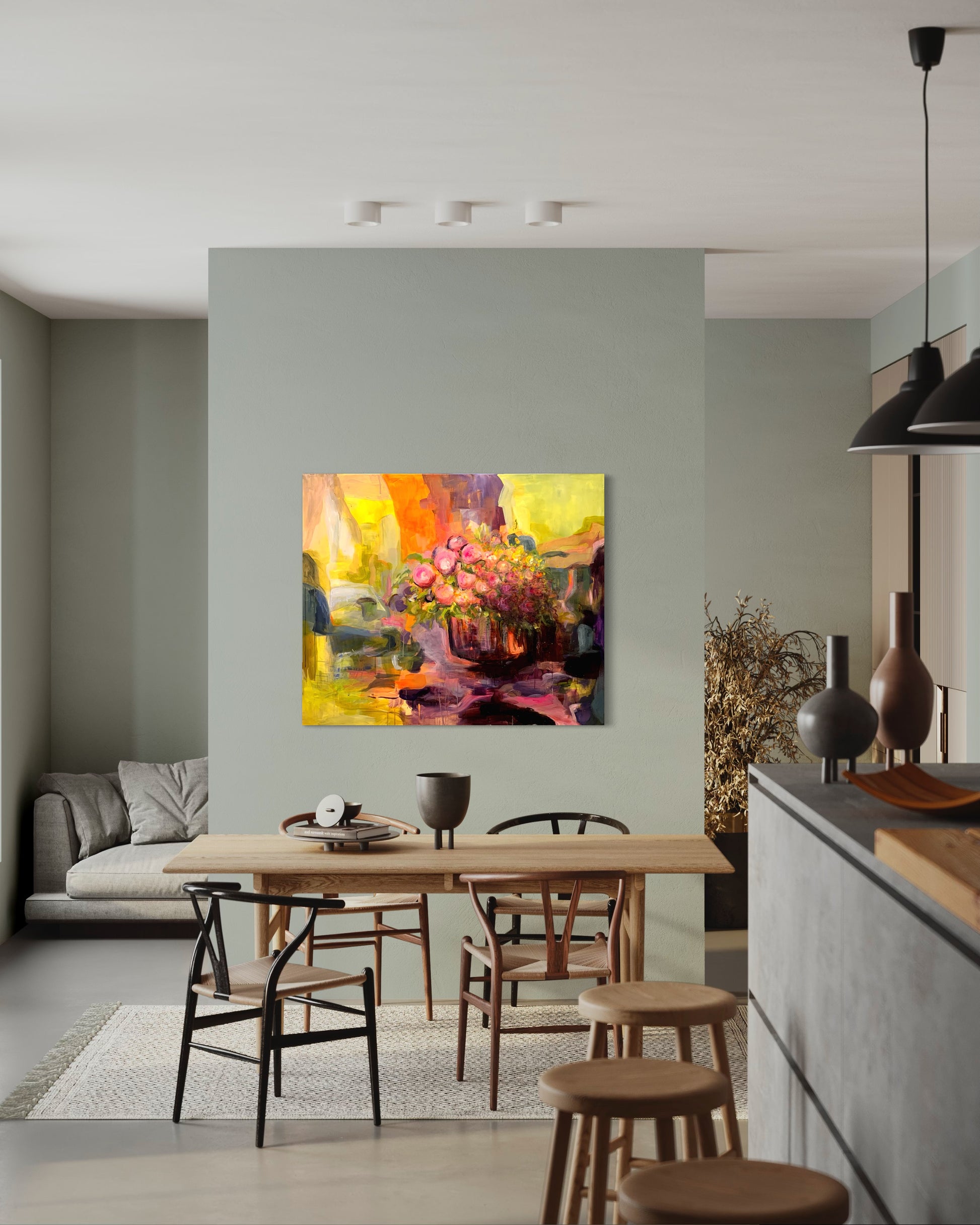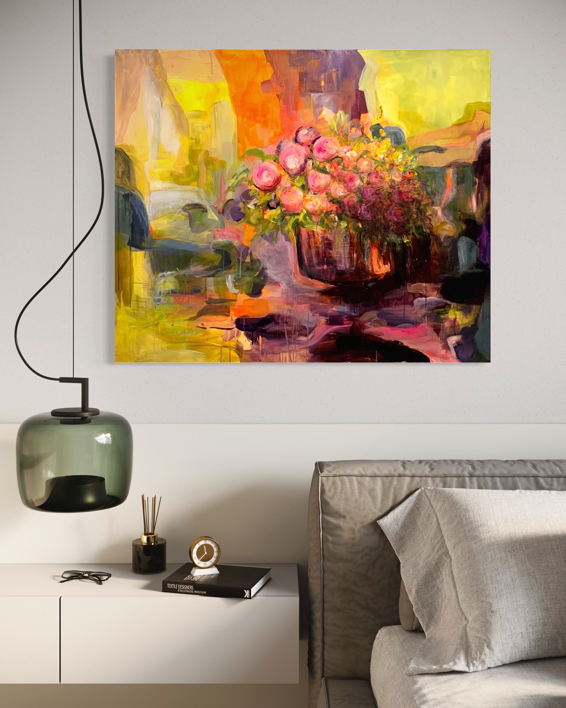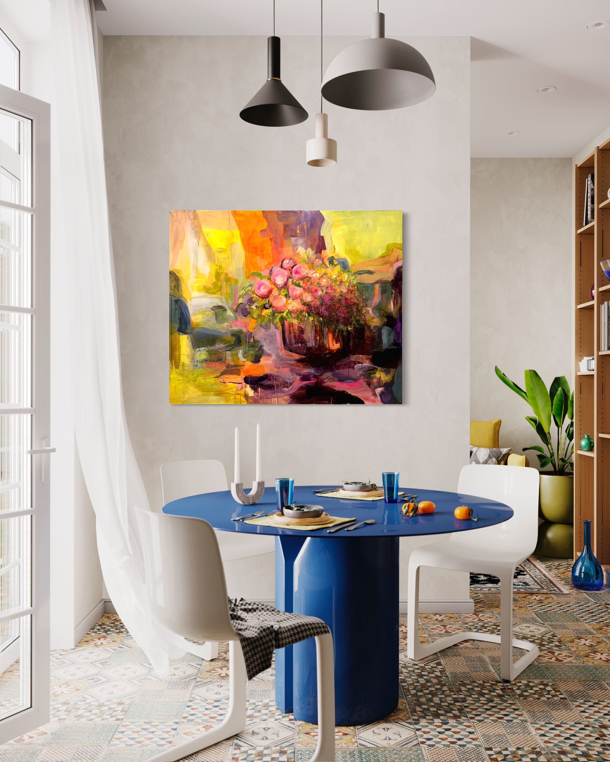 Motivet kommer från fritt skapande, figurativt abstrakt, med en koppling till blommor. Blommor är lite som karameller av energi och glädje. Även om den är abstrakt, är det som en kruka med blommor.