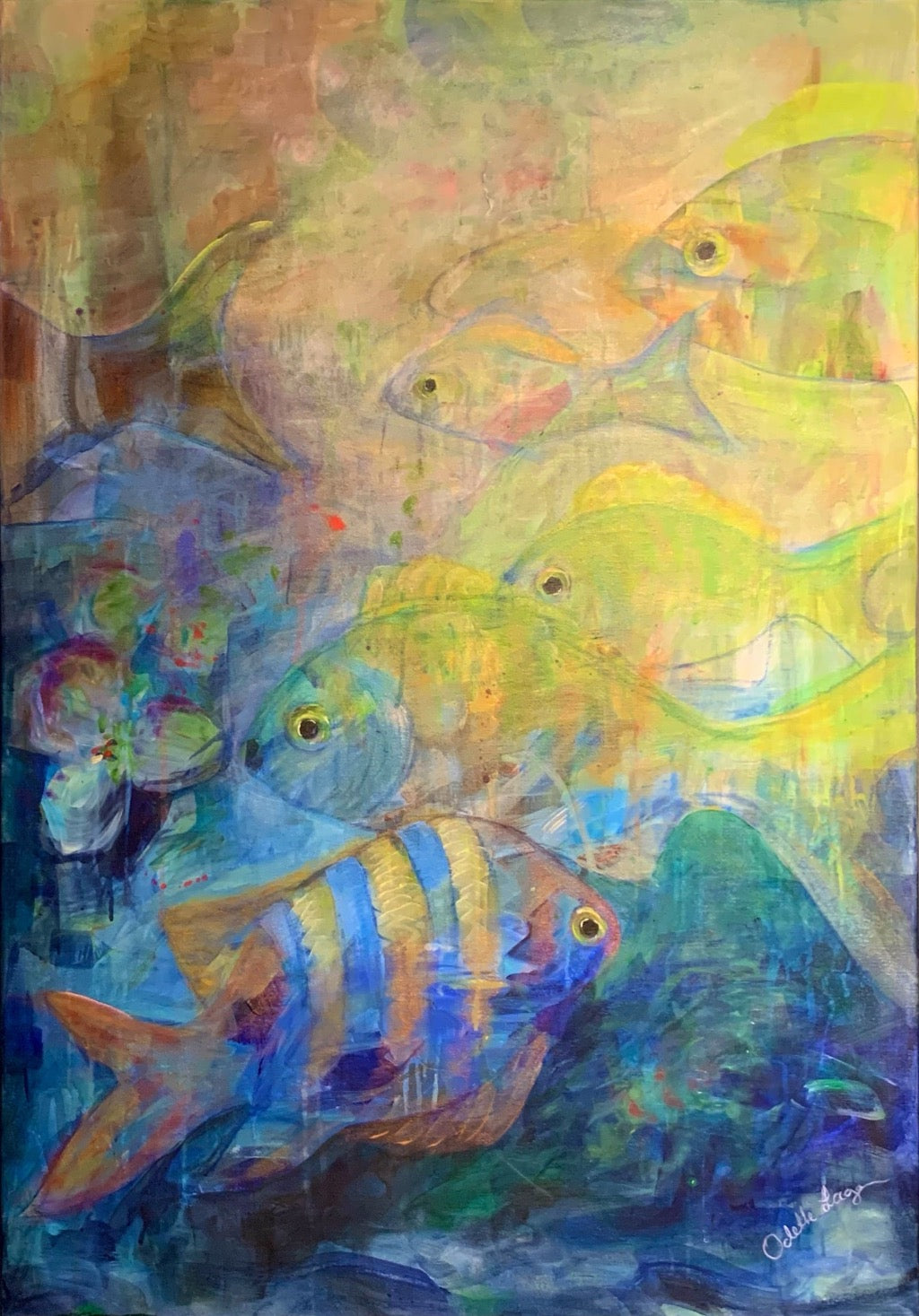 Det är fluorescerande färger som lyser i UV-ljus på denna tavla. Titta på den med UV-ljus och du får se lite fishlife.