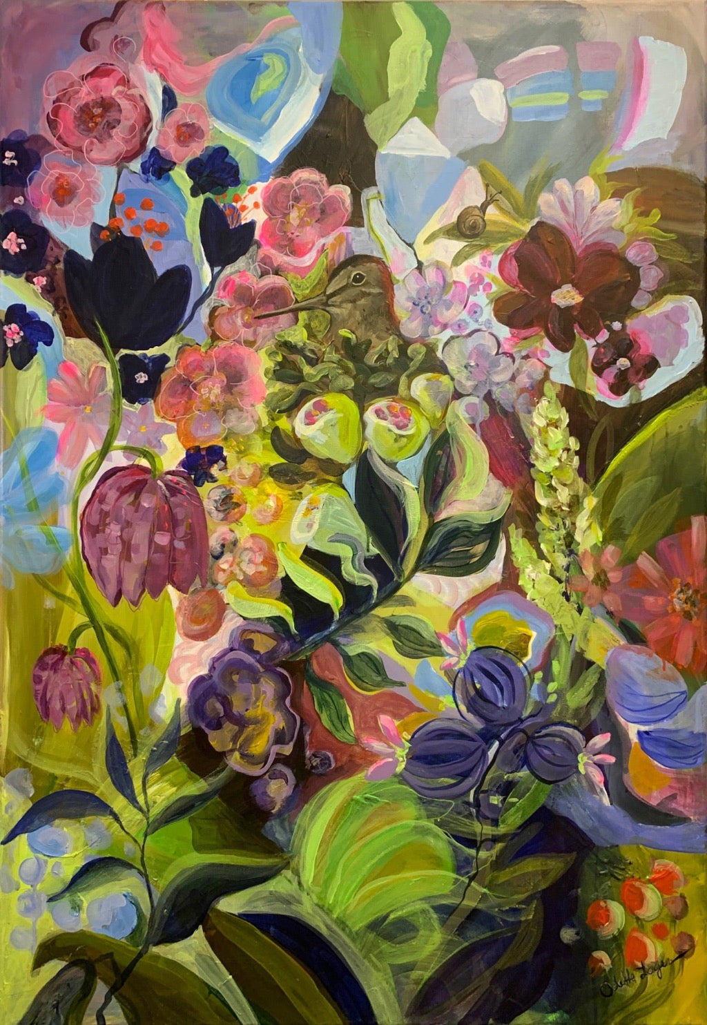 Uppspänd duk på kilram (4 cm djup). Akrylfärg. Lackad för extra skydd. Vajer på baksidan för upphängning.