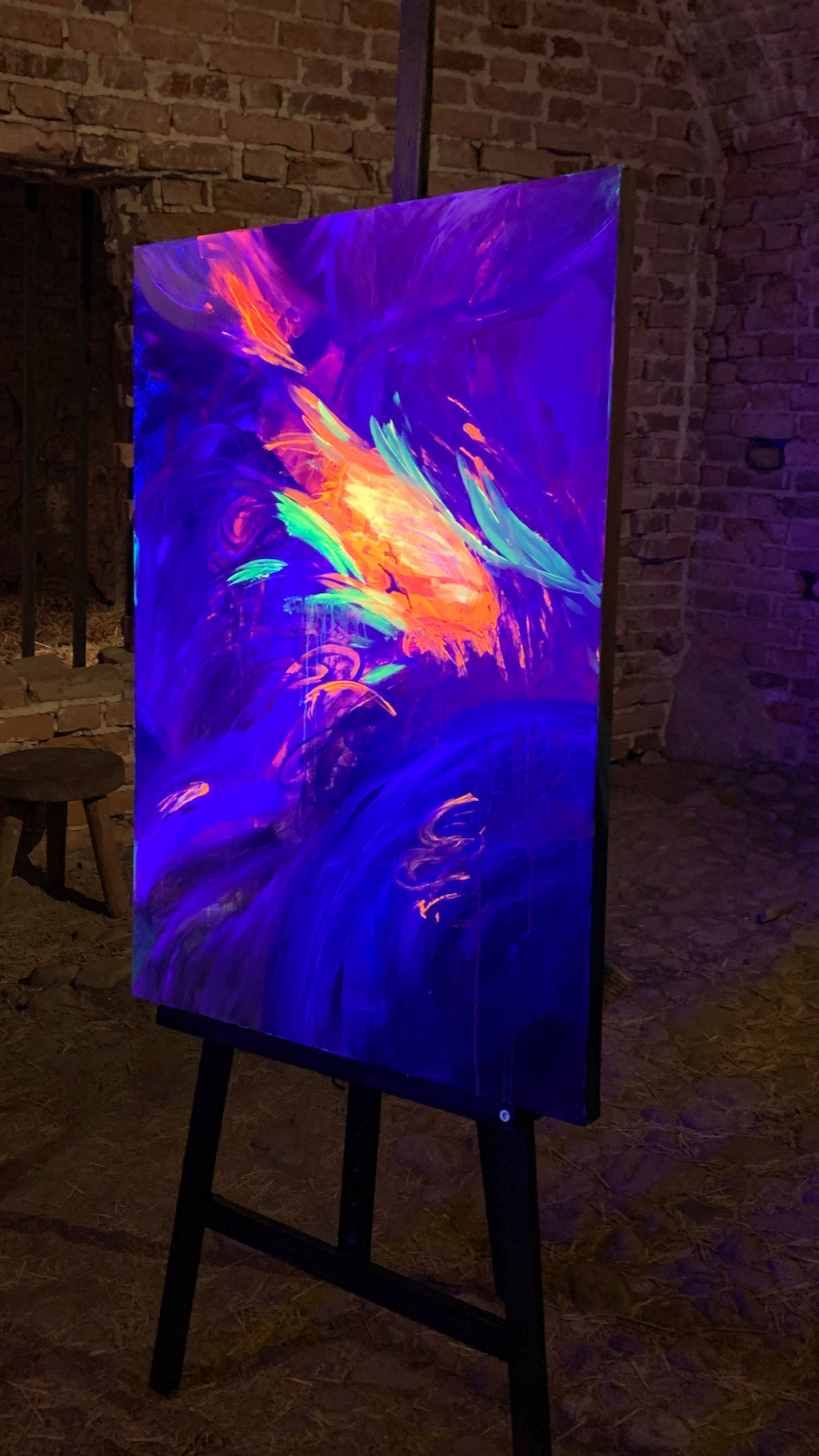 Det är lite fluorescerande färger som lyser i UV-ljus på denna tavla. Titta på den med UV-ljus och du får se en glimt av framtiden.