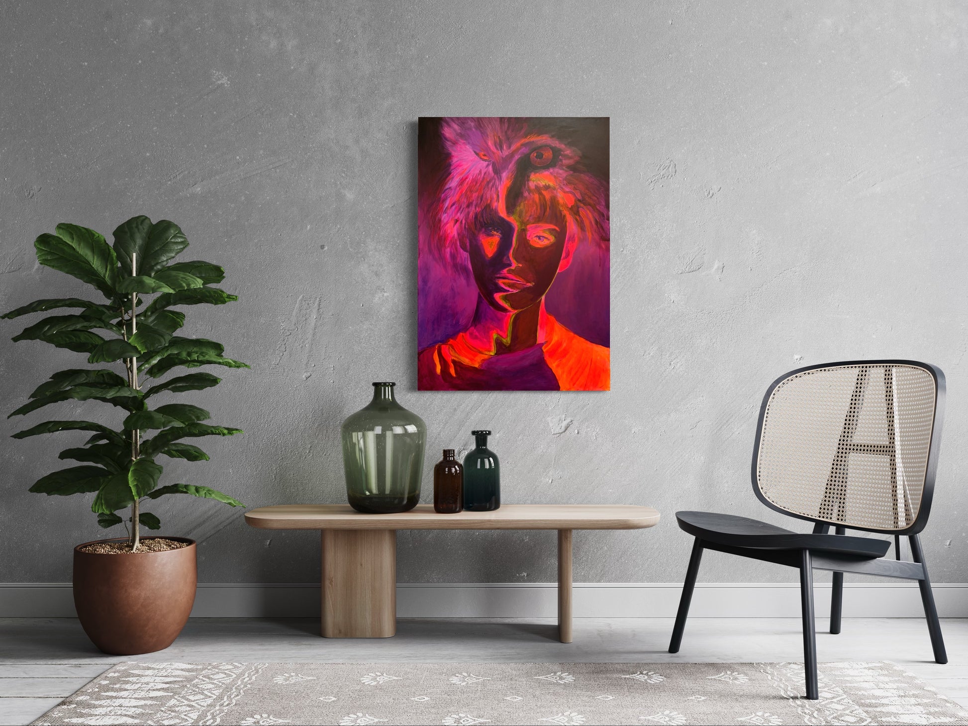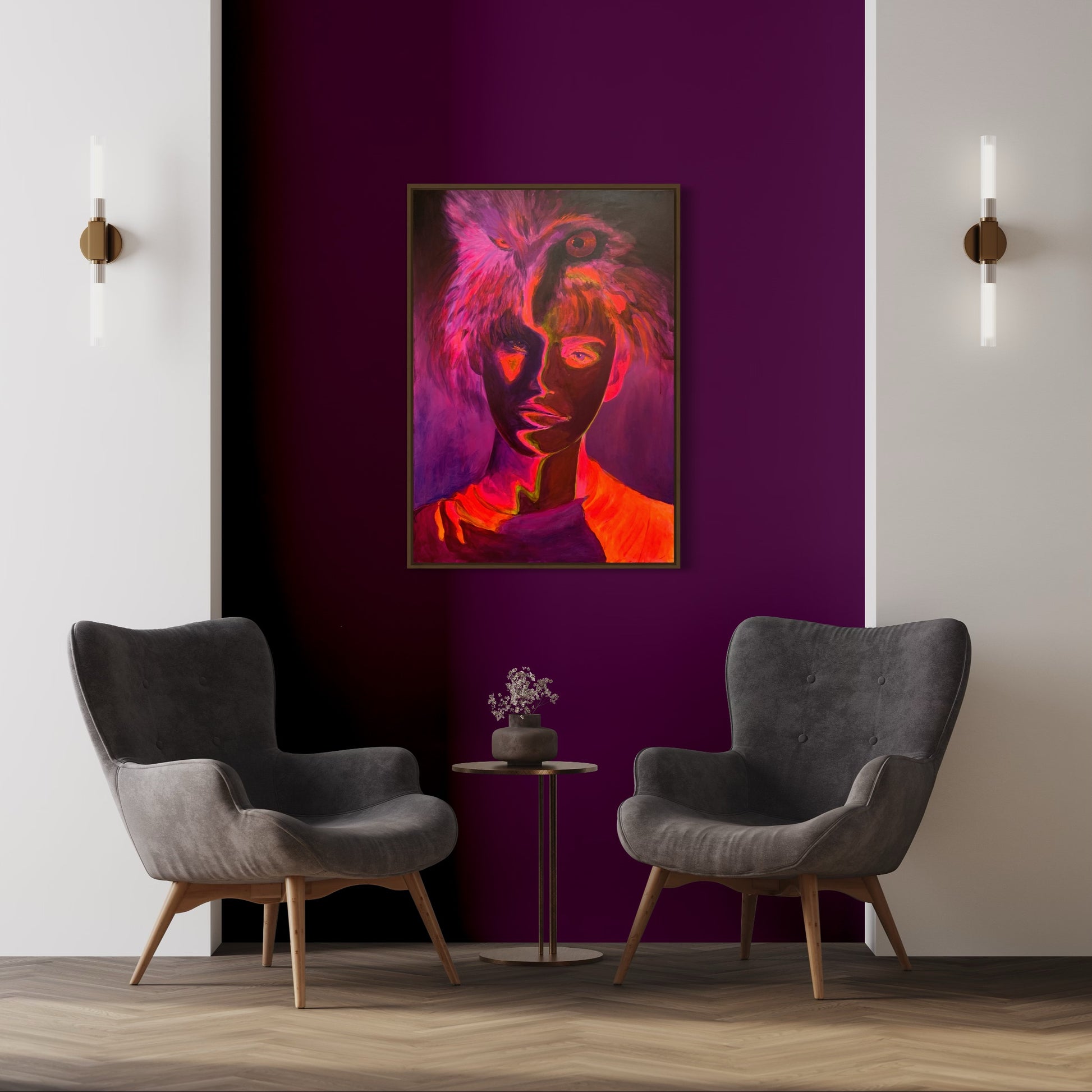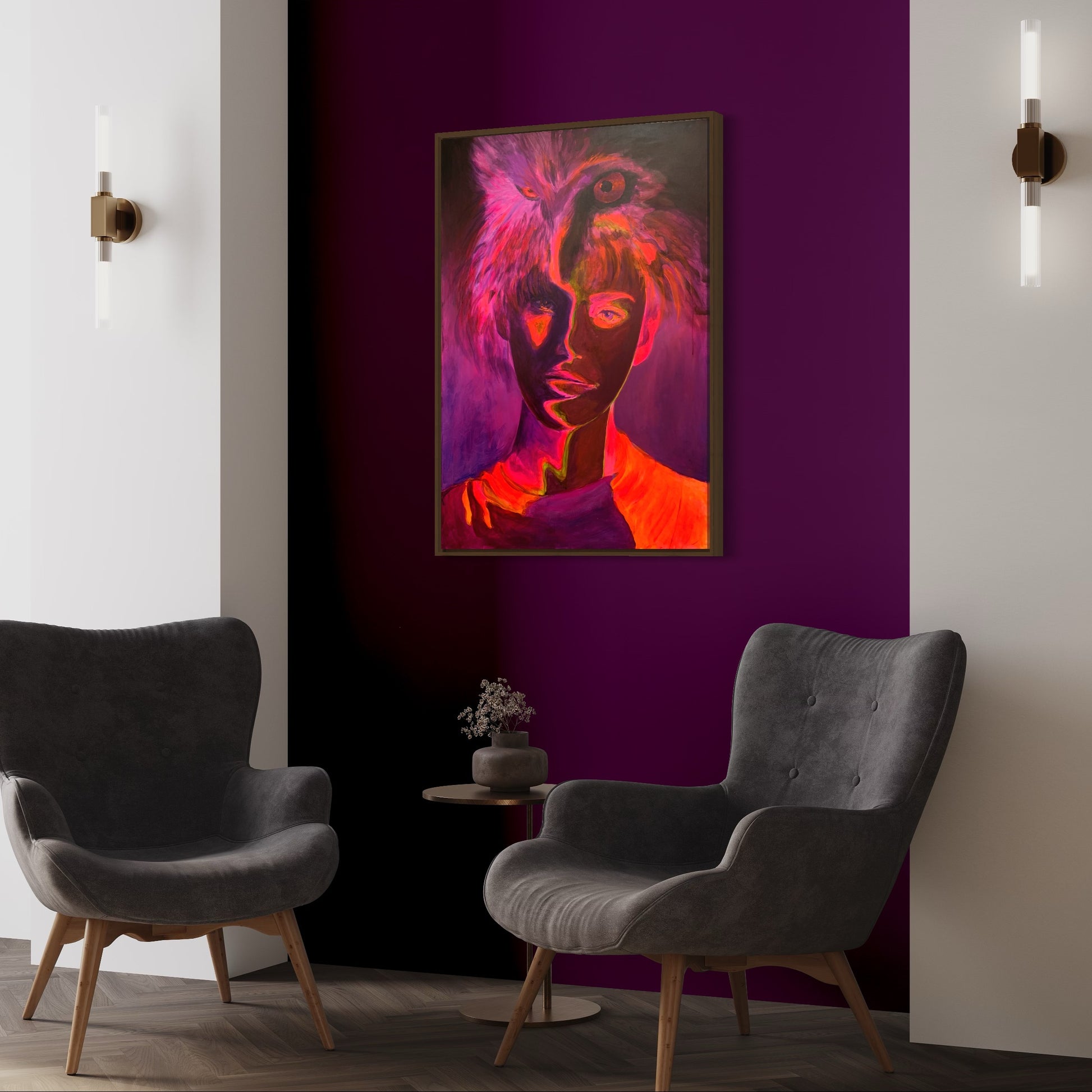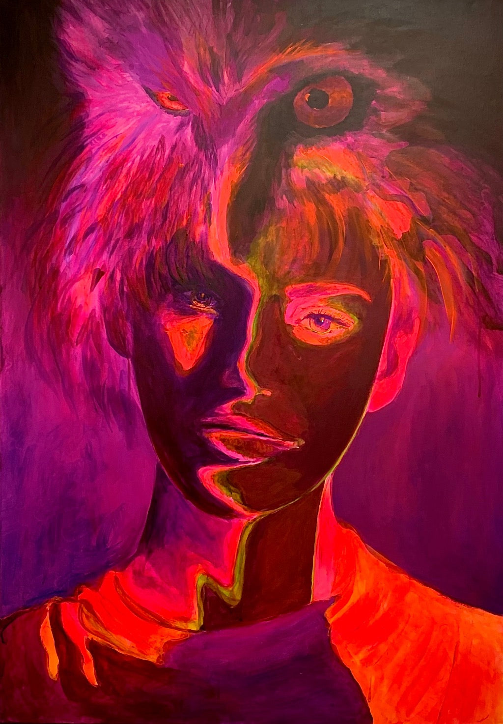Det är fluorescerande färger som lyser i UV-ljus på denna tavla. Titta på den med UV-ljus och du får se en glimt av din inre styrka.