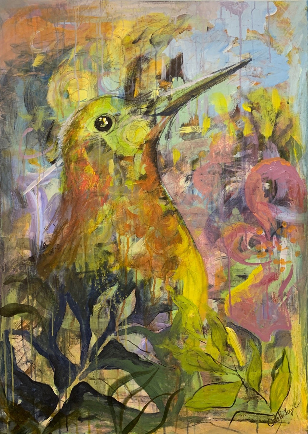Uppspänd duk på kilram (4 cm djup). Akrylfärg. Lackad för extra skydd. Vajer på baksidan för upphängning.