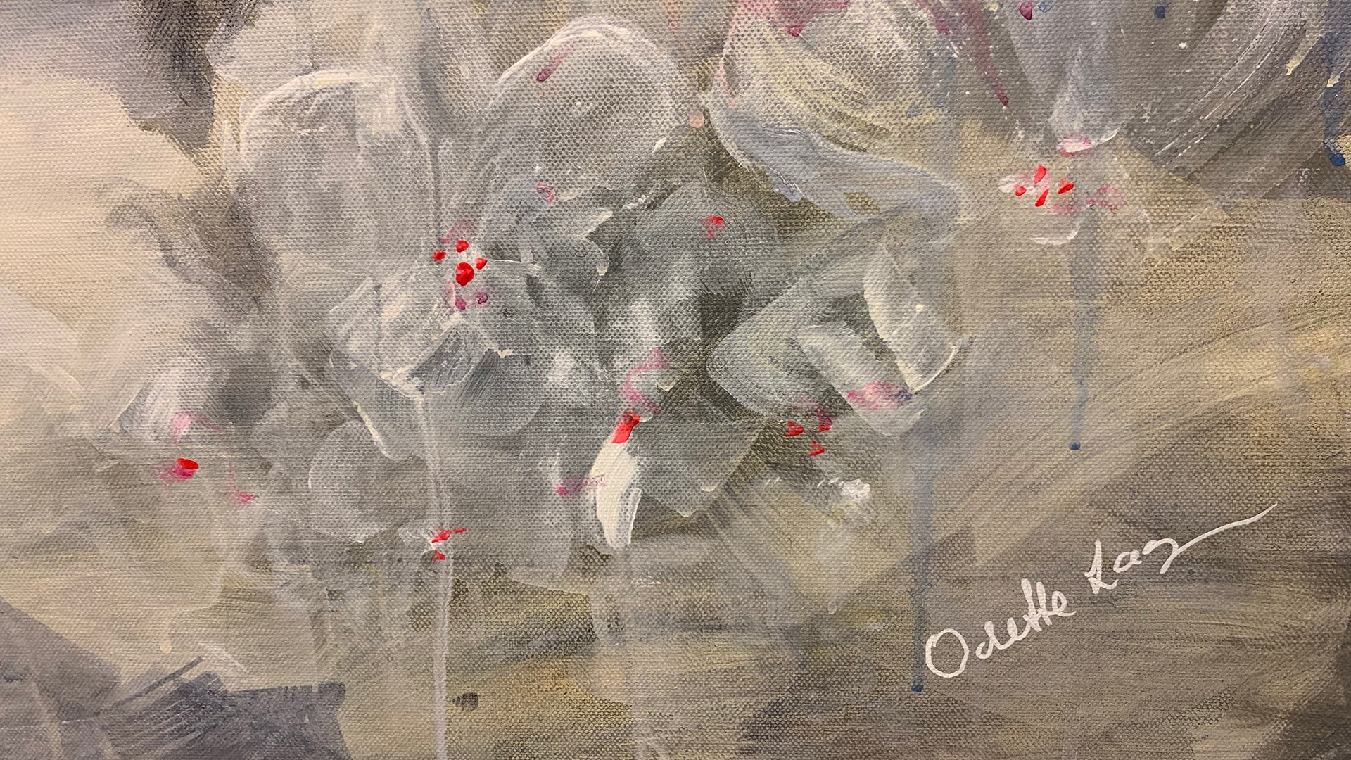 Uppspänd duk på kilram (4 cm djup). Akrylfärg. Också viss fluorescerande färger som lyser i UV-ljus. Lackad för extra skydd. Vajer på baksidan för upphängning.