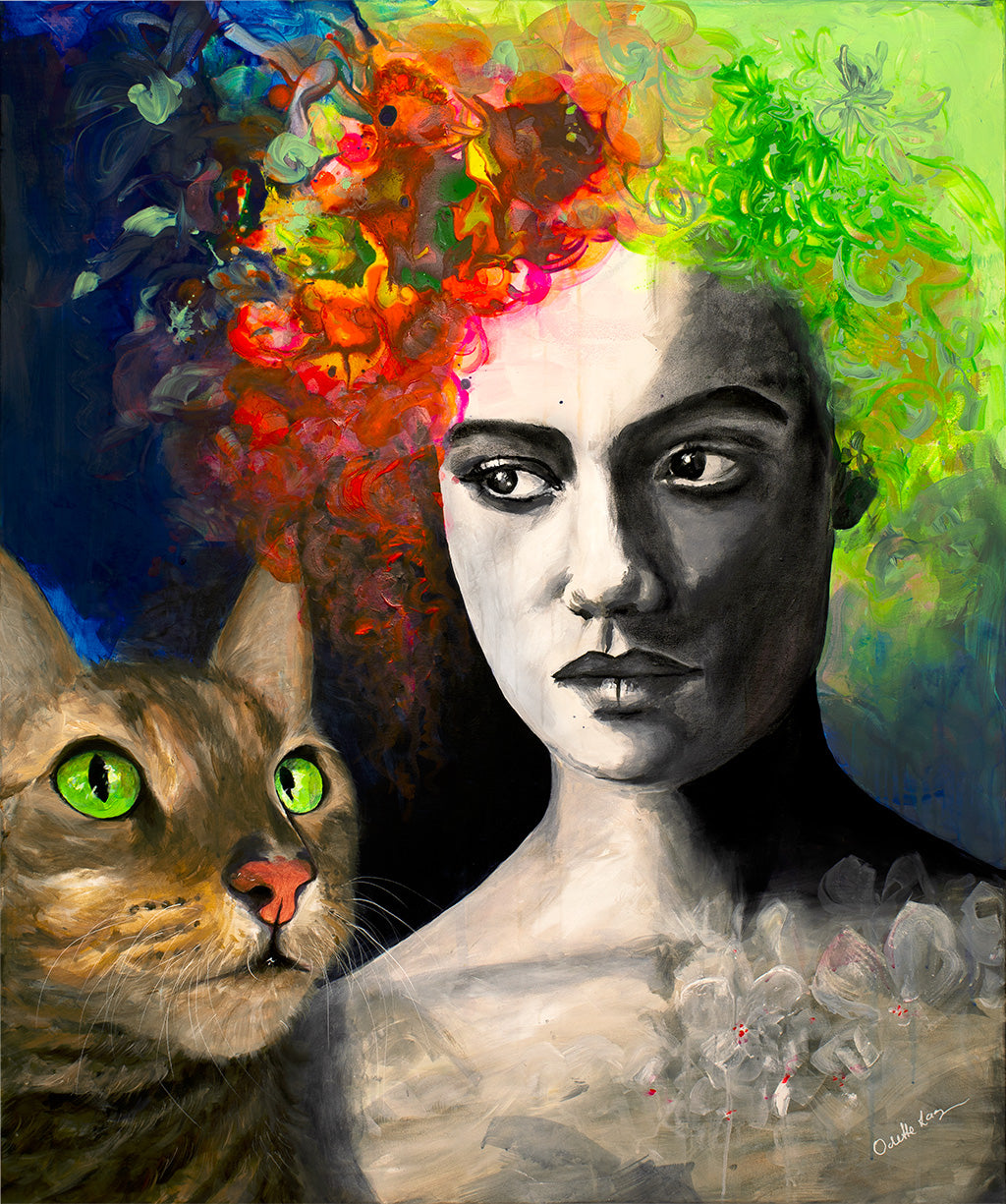 Alla färger runt hennes huvud symboliserar livet och allt som händer runt henne hela tiden. Hon finns där inne och är samma men utvecklas med allt som händer utanför. I mörka tider när hon själv kanske inte kan se så bra och känner sig lite osynlig så ser katten åt henne. Katten som har sju liv kan trotsa utmaningarna. Man brukar säga ”slick som en katt”. Kanske katten är hennes inre styrka som ändå finns där, hennes sjätte sinne som du kan lita på…